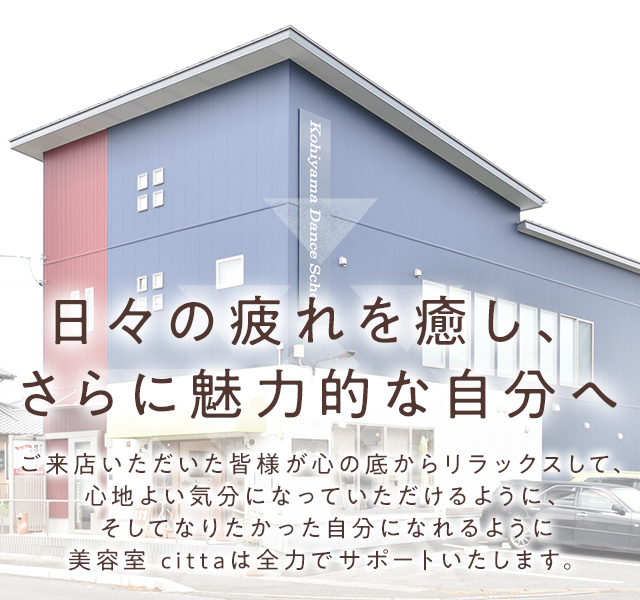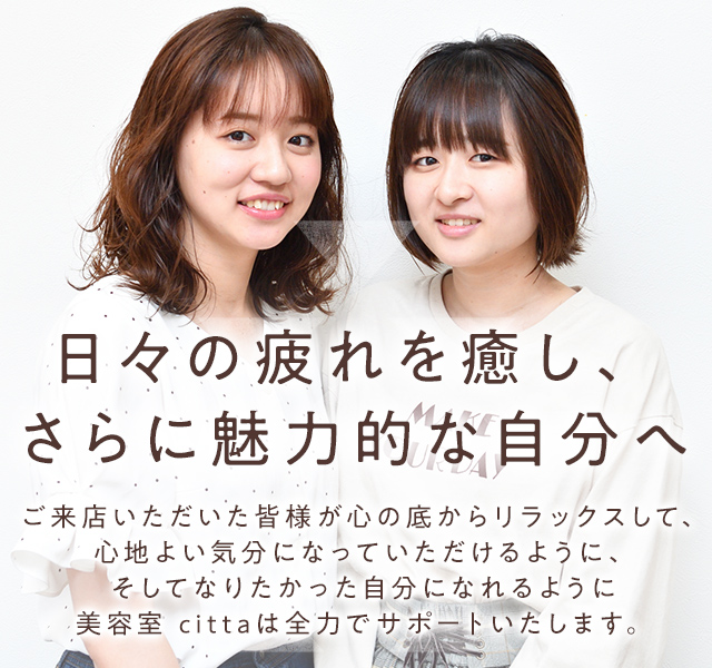お客様が心からくつろいで施術を受けていただけるように、細かな心配りを忘れず、丁寧な接客を行っております。是非日頃の疲れを癒されに美容室 cittaまでお越しください。